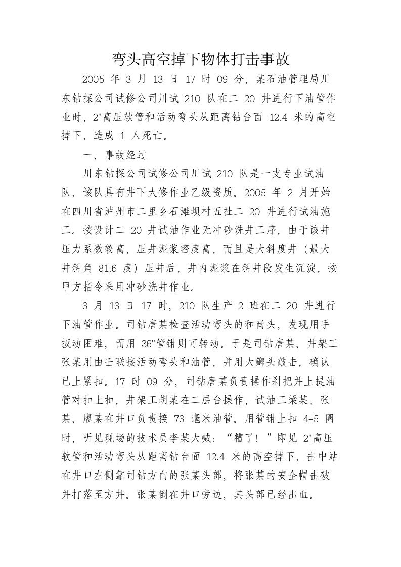 首页事故案例事故调查报告弯头高空掉下物体打击事故