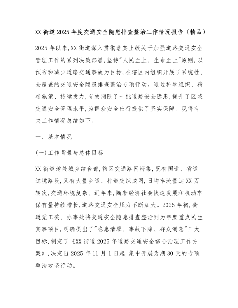 XX街道2025年度交通安全隐患排查整治工作情况报告(精品)