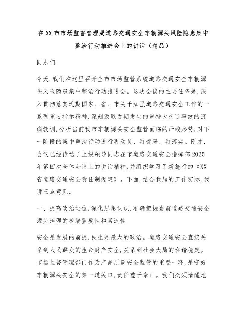在XX市市场监督管理局道路交通安全车辆源头风险隐患集中整治行动推进会上的讲话(精品)