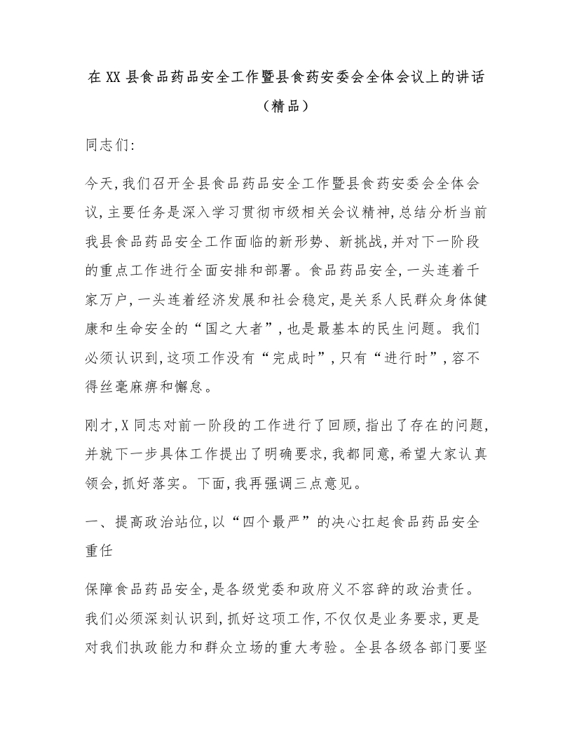 在XX县食品药品安全工作暨县食药安委会全体会议上的讲话(精品)