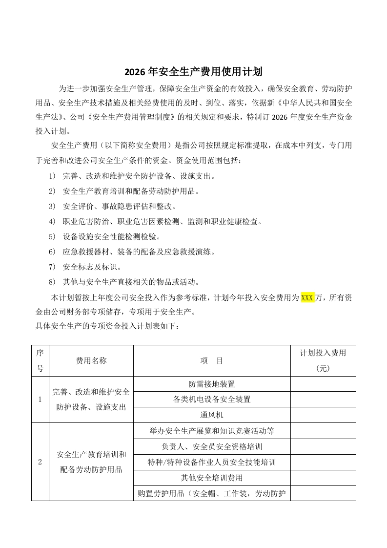 2026年度安全投入安全费用使用计划