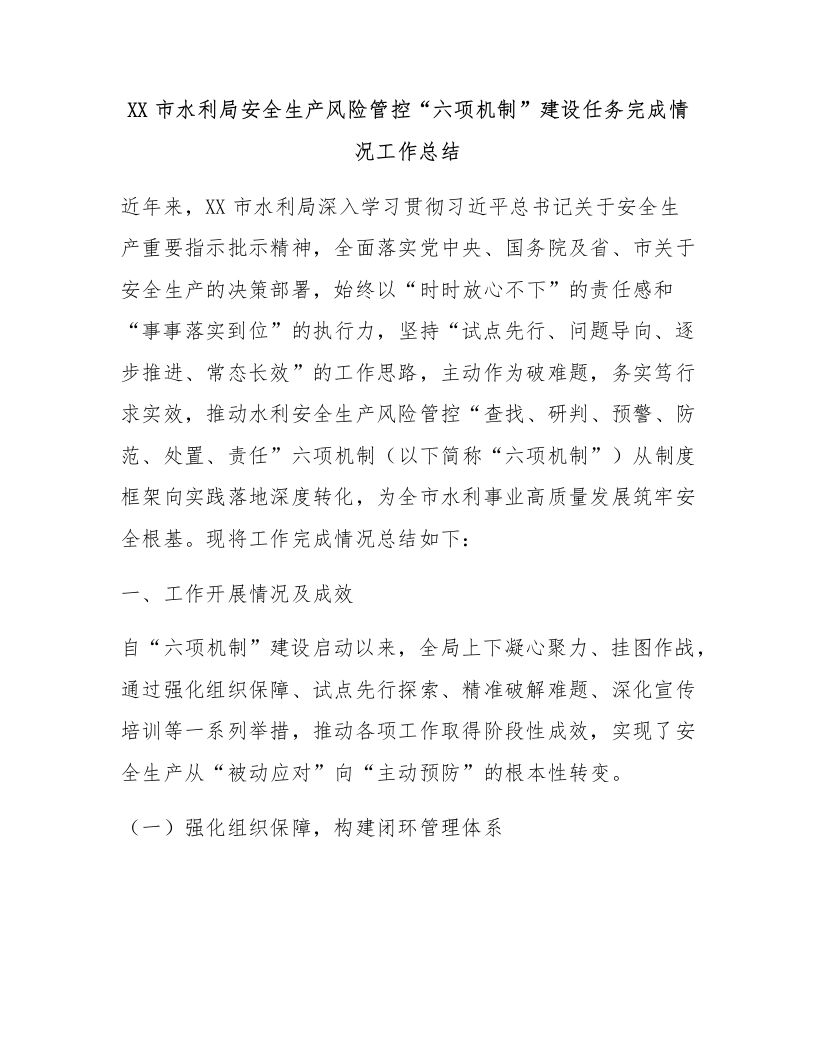 XX市水利局安全生产风险管控“六项机制”建设任务完成情况工作总结