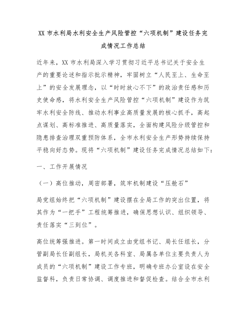 XX市水利局水利安全生产风险管控“六项机制”建设任务完成情况工作总结