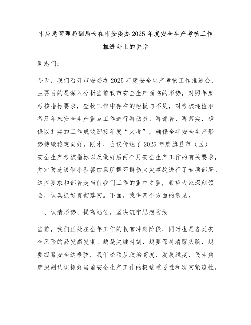 首页安全文档综合市应急管理局副局长在市安委办2025年度安全生产考核工作推进会上的讲话