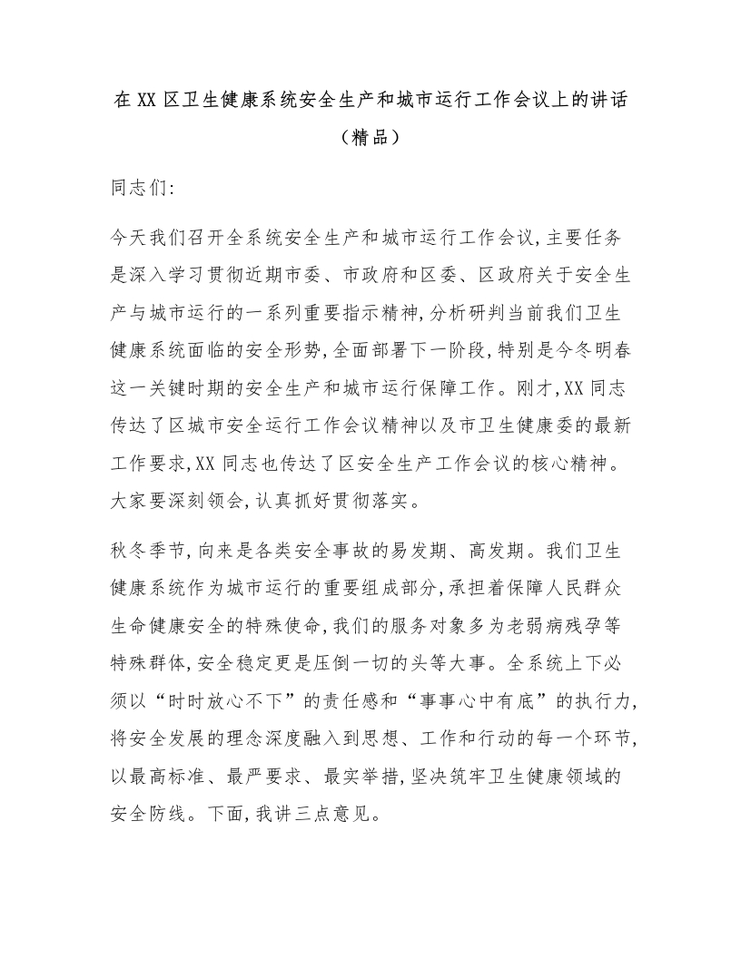 在XX区卫生健康系统安全生产和城市运行工作会议上的讲话(精品)